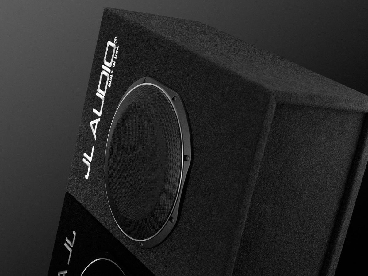 Finish: Black, high-grade automotive carpet with silver “JL AUDIO” embroidery on front baffle. A steel mesh grille is included to protect the subwoofer driver.