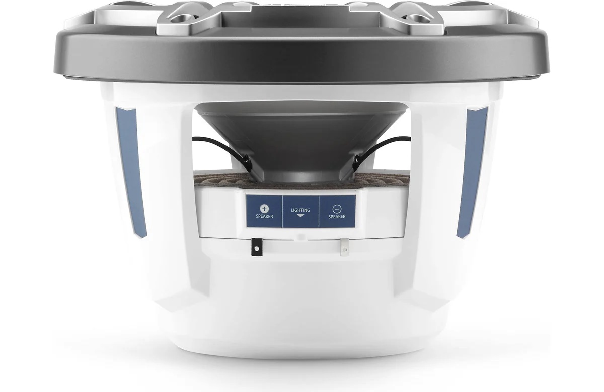 Materials: The woofer cone is mica-filled injection-molded polypropylene (IMPP) with UV inhibitors. The surrounds are synthetic rubber and the woofer uses a marine-grade synthetic fiber spider with a progressive roll design. The basket and grille are UV-resistant polymer; the basket encapsulates the woofer’s motor system to prevent corrosion.
