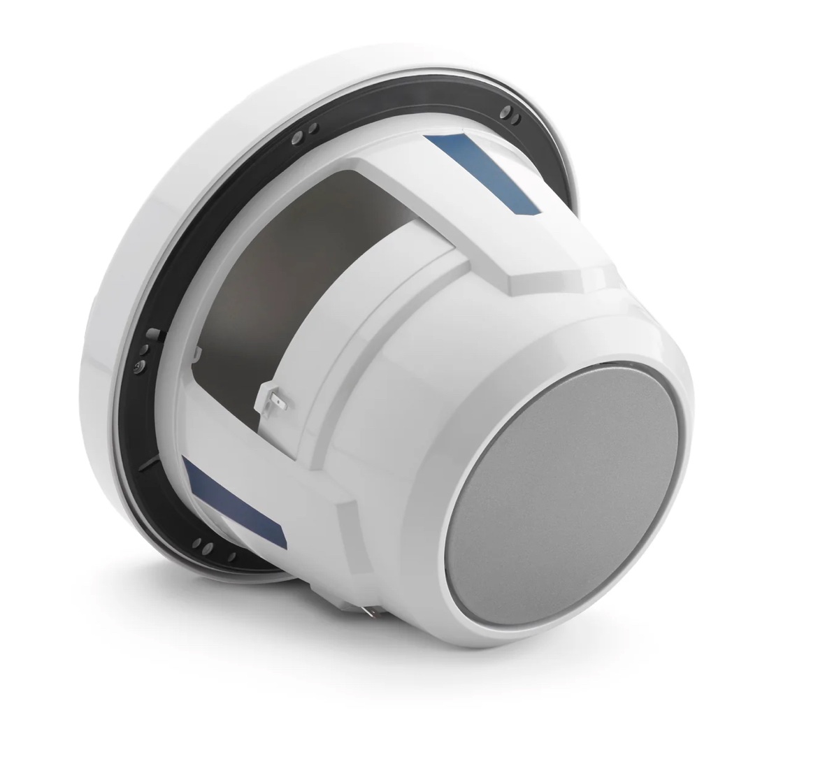Materials: The woofer cone is mica-filled injection-molded polypropylene (IMPP) with UV inhibitors. The surrounds are synthetic rubber and the woofer uses a marine-grade synthetic fiber spider with a progressive roll design. The basket and grille are UV-resistant polymer; they encapsulate the woofer’s motor system to prevent corrosion.