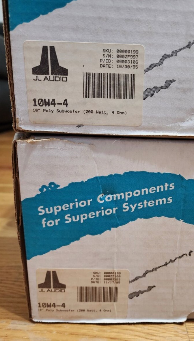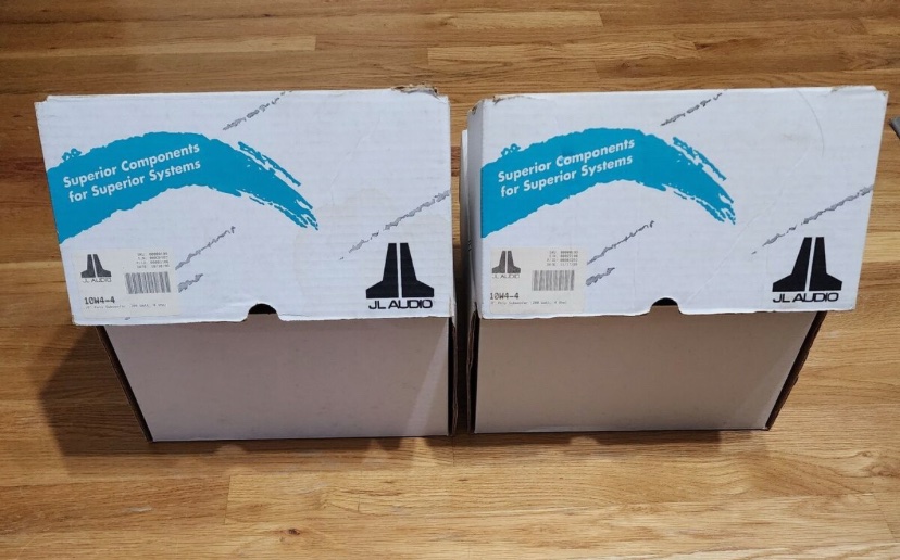 Upgrade your car audio with New Old Stock JL Audio 10w4 4ohm subwoofers. Experience dynamic, high-performance bass in pristine condition with double boxed original packaging.